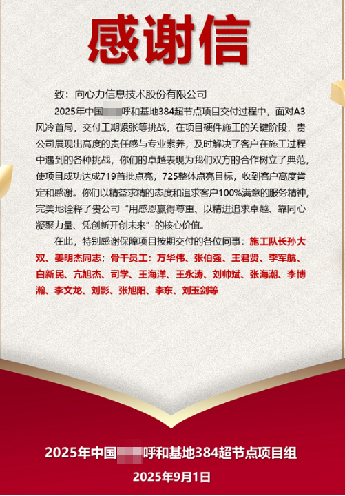 近日,公司再次收到客户发来的表扬信,信中高度赞扬了公司在项目交付中展现出的高效执行力和优质服务,并对现场技术服务团队的专业素养和奉献精神给予充分肯定。在内蒙古呼和基地384超节点项目中,面对A3风冷首局,交付工期紧张等挑战,公司迅速响应、通力协作,组建孙大双、姜明杰、万华伟、张伯强、王君贤、李军航、白新民、亢旭杰、司学、王海洋、王永涛、刘帅斌、张海潮、李博瀚、李文龙、刘影、张旭阳、李东、刘玉剑等近20余名技术骨干团队奋战一线,抢抓工期,使项目成功达成719首批点亮,725整体点亮目标,受到客户高度肯定和感谢。